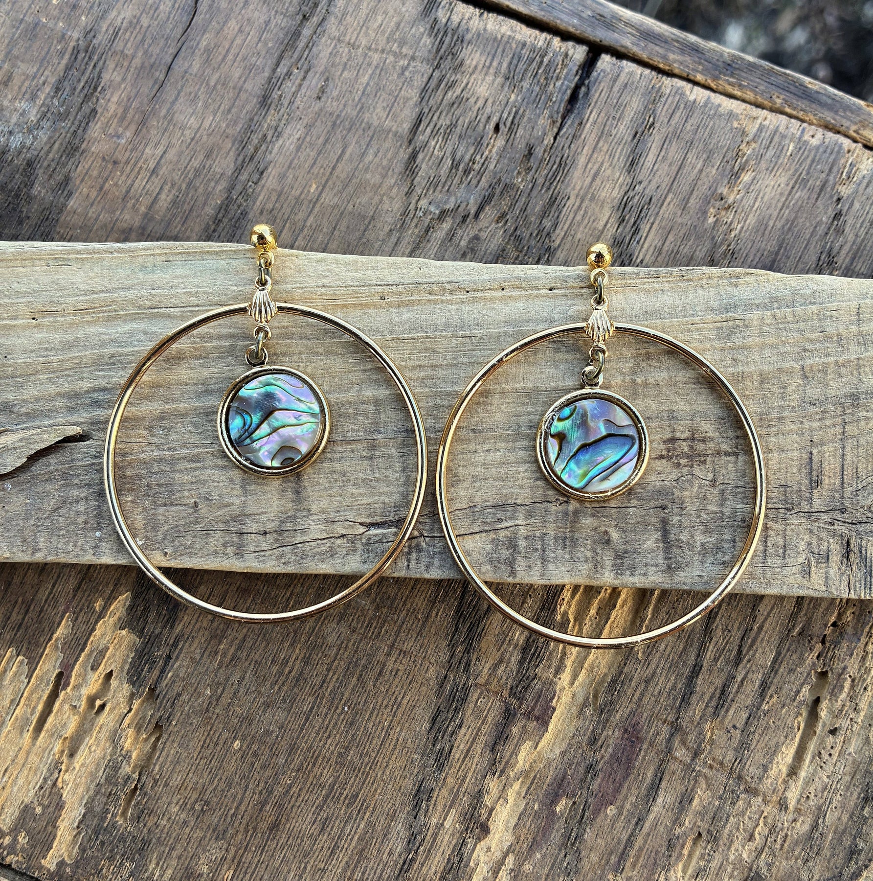 A gorgeous pair of statement earrings handmade using all upcycled materials. Abalone and gold plate make these a beachy boho dream. Details: -Vintage Abalone & gold plate charms -Charms measure 3/4 inches long & 5/8 inches wide -Vintage gold plated hoop components -Vintage gold plated posts -Nickel free -Measure 2 1/4 inches long & 1 7/8 inches wide