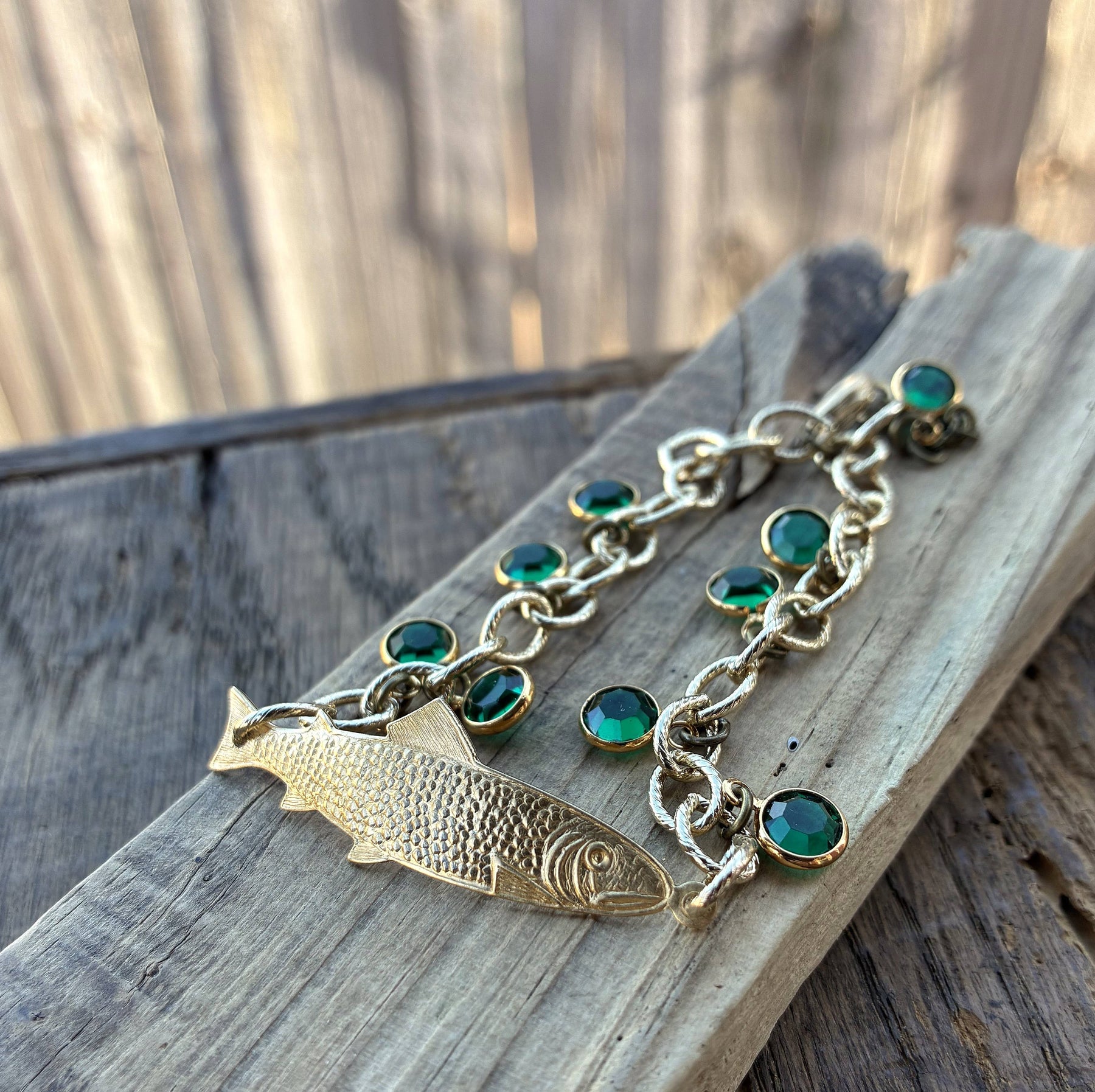 A unique, gold plated fish bracelet with vintage green Swarovski crystals. Details: -Brass fish; clear coated -Vintage green Swarovski crystals -Vintage gold plated etched link chain -7.25 inches long; 1 inch extender -Nickel Free