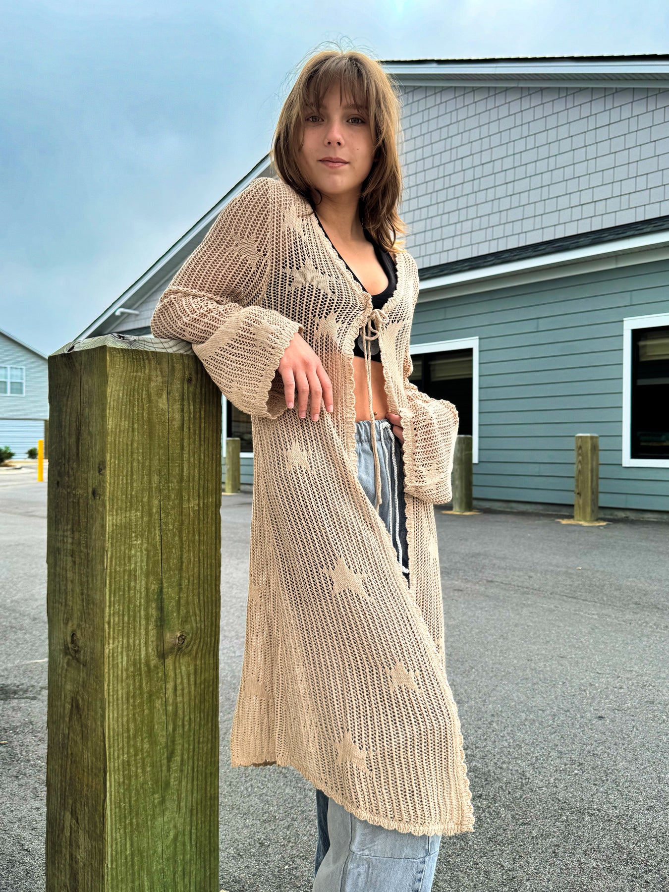 A lightweight, breezy design with intricate celestial-inspired lace patterns of moons and stars. Its longline silhouette features scalloped edges, wide sleeves, and an open front with a delicate tie closure for a soft, feminine touch. Perfect for layering over casual outfits or dresses, this cardigan brings a whimsical charm to your wardrobe. Made with care, it is available in versatile shades like Sand, Navy, and Black, catering to a variety of styles and preferences.