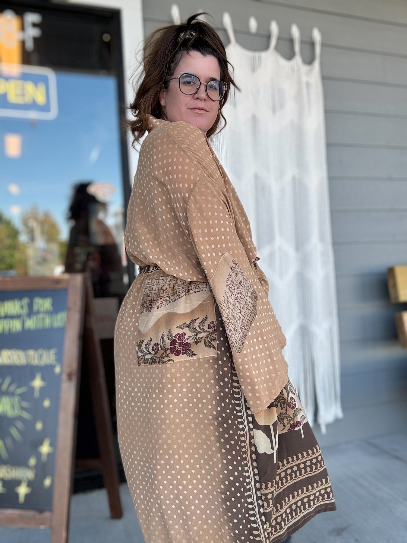 This groovy statement piece is crafted from our ultra lux vintage crepe silk sari.