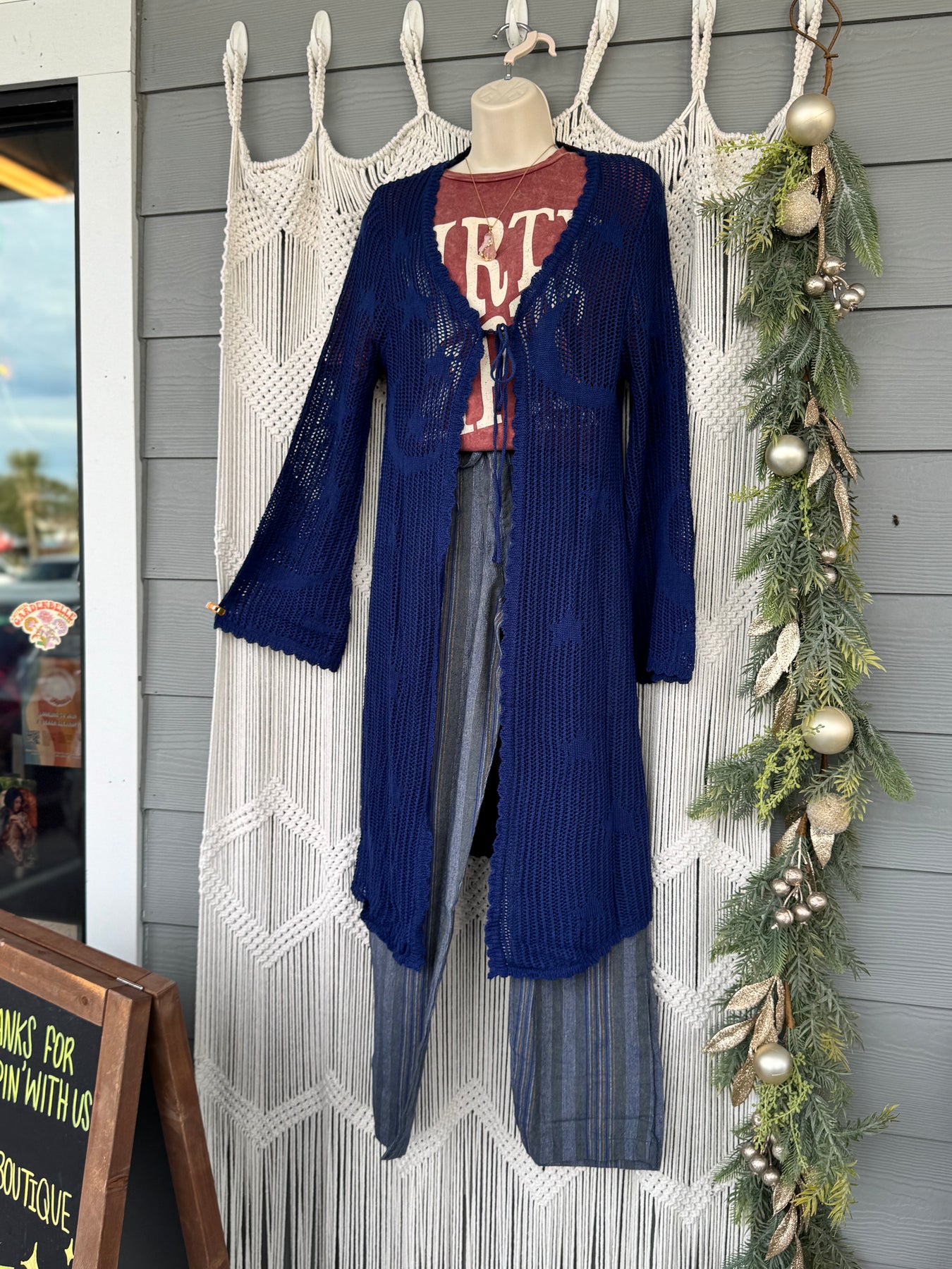 A lightweight, breezy design with intricate celestial-inspired lace patterns of moons and stars. Its longline silhouette features scalloped edges, wide sleeves, and an open front with a delicate tie closure for a soft, feminine touch. Perfect for layering over casual outfits or dresses, this cardigan brings a whimsical charm to your wardrobe. Made with care, it is available in versatile shades like Sand, Navy, and Black, catering to a variety of styles and preferences.