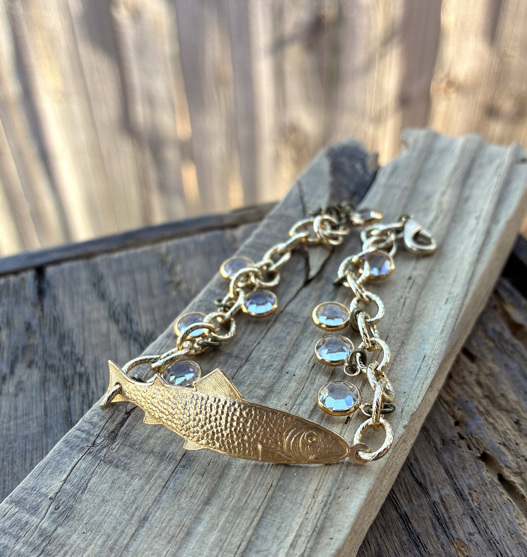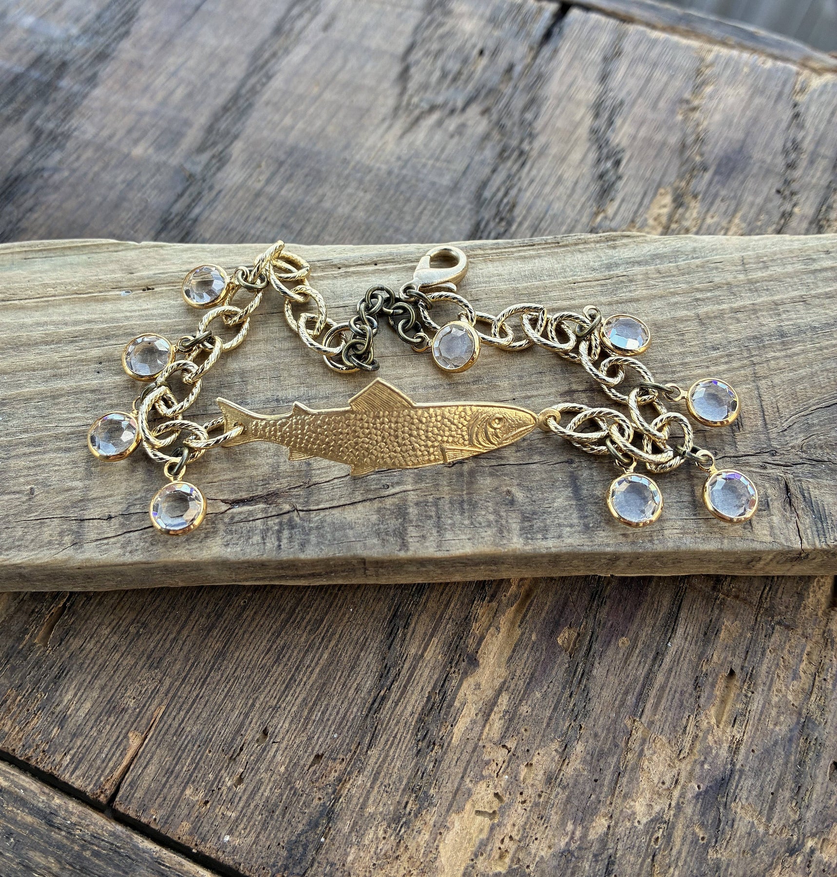 A unique, gold plated fish bracelet with vintage green Swarovski crystals. Details: -Brass fish; clear coated -Vintage green Swarovski crystals -Vintage gold plated etched link chain -7.25 inches long; 1 inch extender -Nickel Free