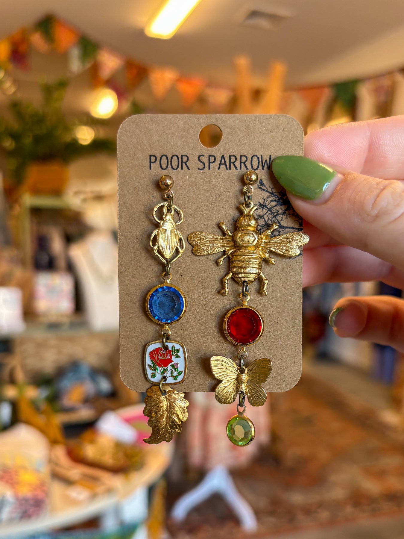 A gorgeous pair of asymmetrical statement charm earrings created using elements you'd find on a stroll throughout nature.