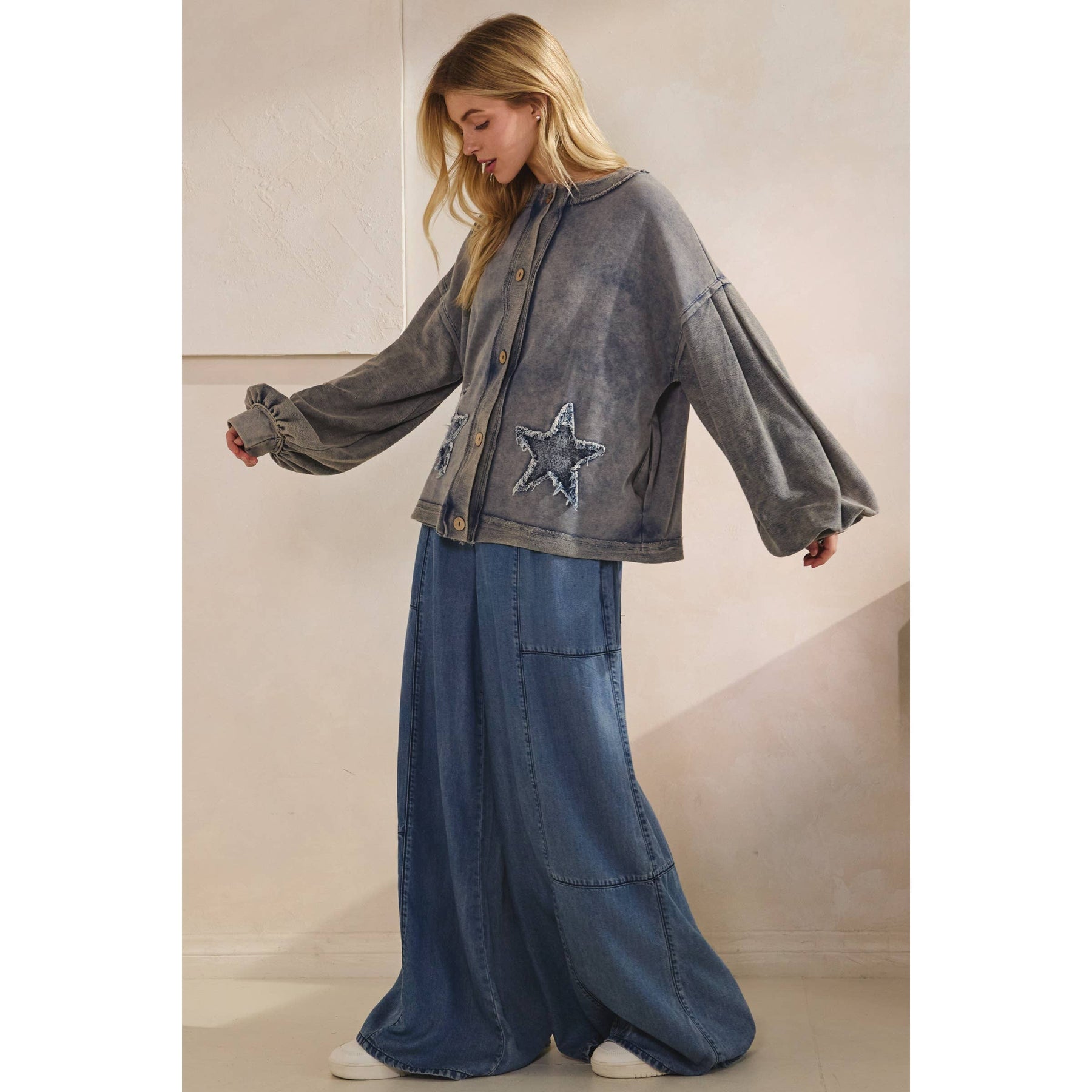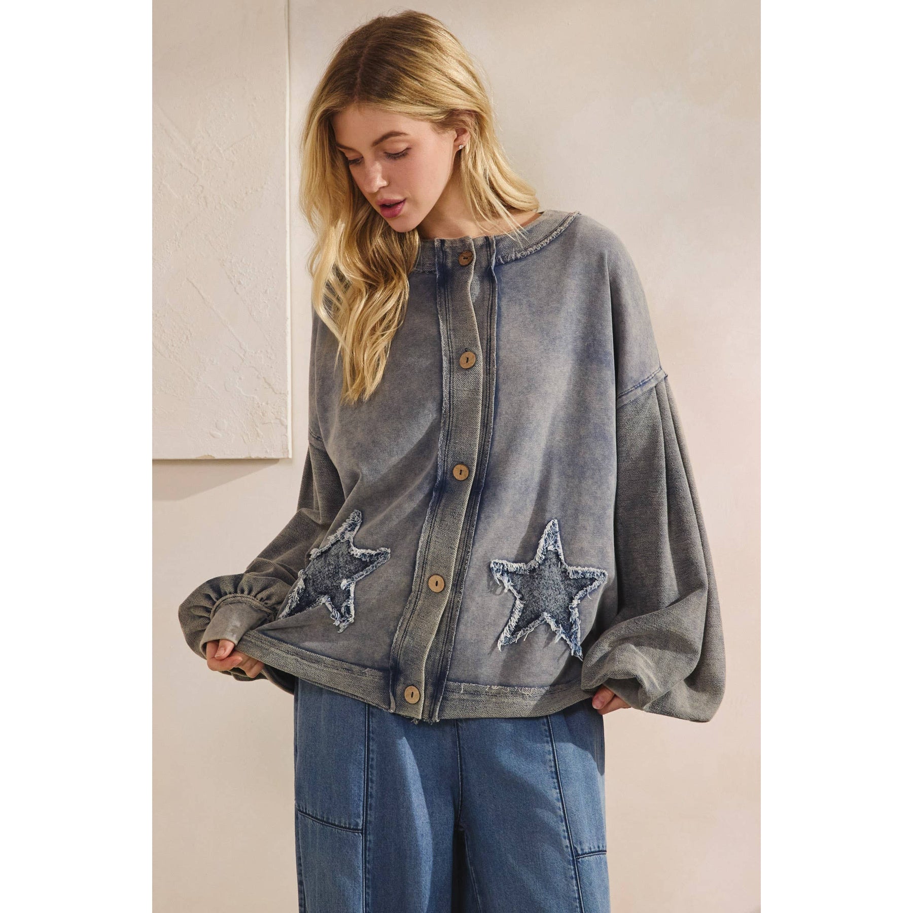 Featuring a mineral-washed finish. This boxy-fit jacket is accented with frayed denim star patches and voluminous balloon sleeves. The wooden button front and raw-edge seams complete its laid-back, standout look. 100% COTTON